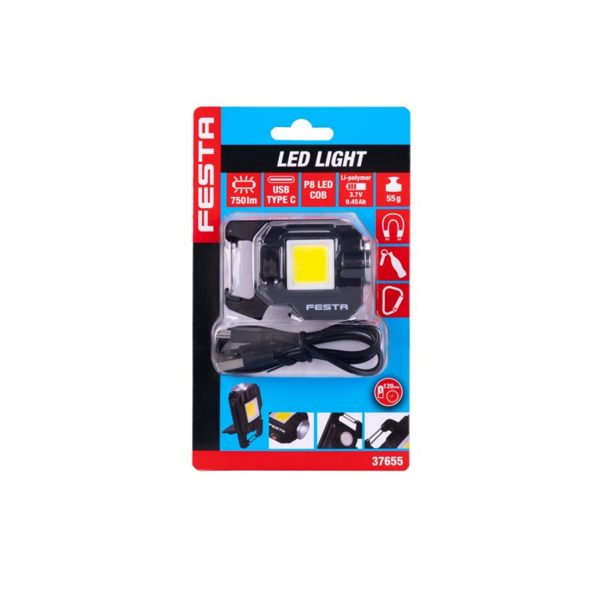 Mini lanternă reîncărcabilă, compactă și versatilă, echipată cu două COB LED-uri pentru un flux luminos ridicat de 750 lm, cu iluminare până la 40 m. Se încarcă rapid prin USB-C (cablu inclus) și folosește o baterie Li-Pol 3,7 V / 0,45 Ah.